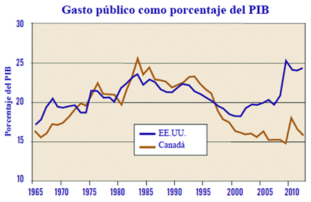Los datos de la Organización para la Cooperación y el Desarrollo Económico (OCDE) muestran que el gasto total de los gobiernos federal, provinciales y locales en Canadá cayó de un máximo de 53 por ciento del PIB en 1992 a solamente 39 por ciento para mediados de los noventa. En 2012, el gasto constituirá 42 por ciento del PIB, que se puede comparar con el gasto público total en EE.UU. de 41 por ciento. El gasto público en ambos países es demasiado alto, pero Canadá por lo menos se ha estado moviendo en la dirección correcta en cuanto a las reformas fiscales.