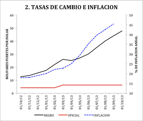 en economía, no puede taparse la realidad con palabras. Como se ve en la gráfica 2, el gobierno chavista ha mantenido casi fijo el tipo de cambio oficial en los últimos doce meses. Pero a ese precio el gobierno no puede satisfacer la demanda de dólares, de tal forma que los que los necesitan para importar todo lo que no se produce en Venezuela (que es todo excepto petróleo) tienen que ir a comprarlos al mercado negro. Y allí es donde se manifiesta la realidad.