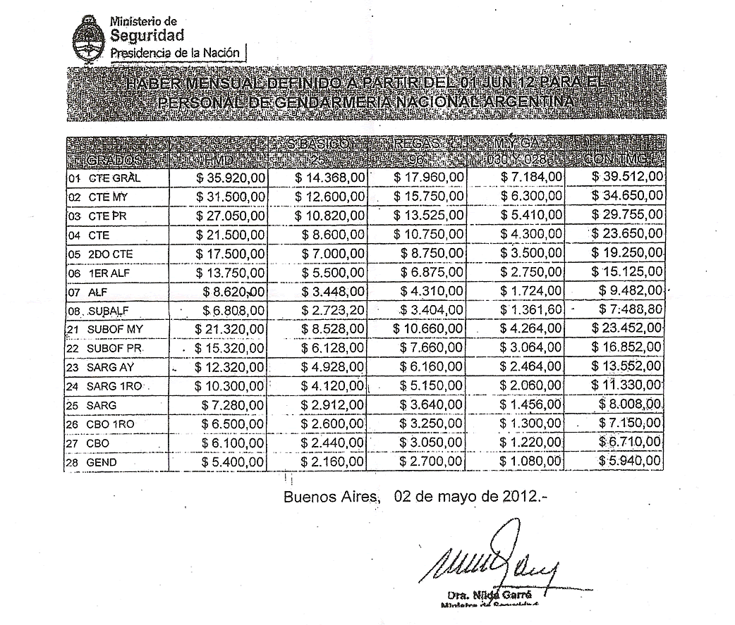 Ante los planteamientos que no demoraron en llegar al Ministerio de la Inseguridad -mis disculpas, de Seguridad- que regentea la Señora Nilda Garré, y dado que deberían descontarse hasta las sumas percibidas por las cautelares otorgadas por los jueces y basadas en el Caso Salas, la referida dependencia pública se vio obligada a rever, inmediatamente, la postura, y configurar una nueva grilla salarial para poner las cosas en su justo término. Hoy -y en carácter exclusivo- damos a conocer a la opinión pública esta grilla, que lleva la firma de la Señora Ministro. E insistimos: los secretos han dejado de existir. (Para ver el material en tamaño completo, hacer click en la imagen, o bien en http://www.elojodigital.com/publicidad/planilla-gendarmeria-prefectura.gif)