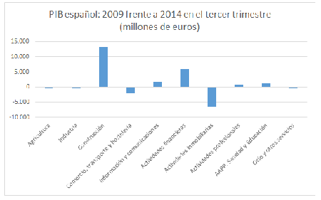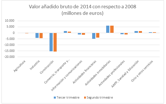 Echemos un vistazo primero al valor agregado bruto de los distintos sectores de la economía española (la suma de todos ellos constituye el PIB) con respecto al que exhibían en 2008. Claramente, existen tres actividades cuyo valor agregado bruto ha caído intensamente con respecto a 2008 (las actividades financieras, la industria y, muy especialmente, la construcción) y un sector que ha aumentado notablemente: las actividades inmobiliarias (también crecen con respecto a 2008, en menor grado, el comercio y la hostelería, y los servicios vinculados a las Administraciones Públicas). En el tercer trimestre, la destrucción bruta de valor con respecto a 2008 era de 27.146 millones de euros (frente a 27.348 millones en el segundo trimestre) y la creación bruta de valor apenas ascendía a 9.624 millones de euros (frente a 9.150 millones en el segundo trimestre).