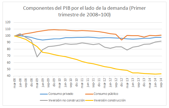 Mas si aspiramos a una economía de alto valor añadido, competitiva y sostenible, no queda otra que cambiar nuestro modelo productivo. ¿Y cómo lo cambiamos? Pues no tratando de resucitar los mortecinos sectores existentes de 2007 (banca y ladrillo), sino creando otros nuevos. Y para crear sectores nuevos no queda otra que invertir en ellos: la clave de nuestra recuperación a largo plazo, pues, no es el gasto en consumo interno, sino en inversión.