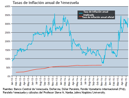 Para calcular la tasa de inflación en Venezuela, todo lo que se requiere es una aplicación un tanto directa de una teoría económica estándar que ha sobrevivido la prueba del tiempo (léase: PPP). Utilizando datos de mercado negro que el Proyecto de Monedas en Problemas de la Universidad Johns Hopkins y el Cato Institute ha recolectado a lo largo del último año, estimo que la actual tasa anual de inflación de Venezuela es de 335% (ver gráfico adjunto).