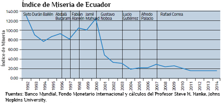 En Ecuador, antes de la implementación de la dolarización en el 2000, el país sostenía un índice de miseria de más de 120. La gente sufría considerablemente por la inflación, pero luego de que se implementara la dolarización, la inflación alta, pero después de que se implementara la dolarización, la inflación alta se controló y la miseria cayó drásticamente. El cuadro adjunto muestra la relación directa entre la dolarización y la caída sostenida de la miseria. Desde 2003 hasta 2014, el índice de miseria en Ecuador ha sido notablemente constante y se ha ubicado en alrededor de 20 —uno de los más bajos en América Latina.