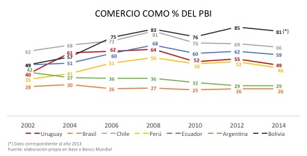Este complejo escenario se tradujo en una caída de los flujos de importación y exportación del país. Desde el año 2000 hasta la fecha, el volumen de comercio exterior, es decir, la suma de las compras y ventas externas, apenas se multiplicó 2,6 veces (166%), consecuencia principalmente del incremento del precio de los productos primarios (soja y sus derivados, maíz y trigo, entre otros). Estos valores se encuentran muy por debajo de otros países de la región como Bolivia (606%), Perú (497%), Ecuador (529%), Chile (328%) y Brasil (309%) -naciones que lograron aprovechar el inmejorable escenario internacional.