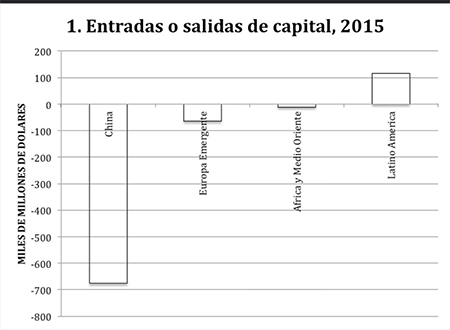La pasada semana, el Instituto de Finanzas Internacionales publicó su estimación sobre las entradas y salidas de capital en los países emergentes durante 2015. Los resultados, mostrados en la gráfica adjunta, son sumamente preocupantes para China, que tuvo una salida de capital de 676 mil millones de dólares. La magnitud del éxodo es tal, que minimiza las salidas de capital de la Europa emergente y de África y el Medio Oriente.