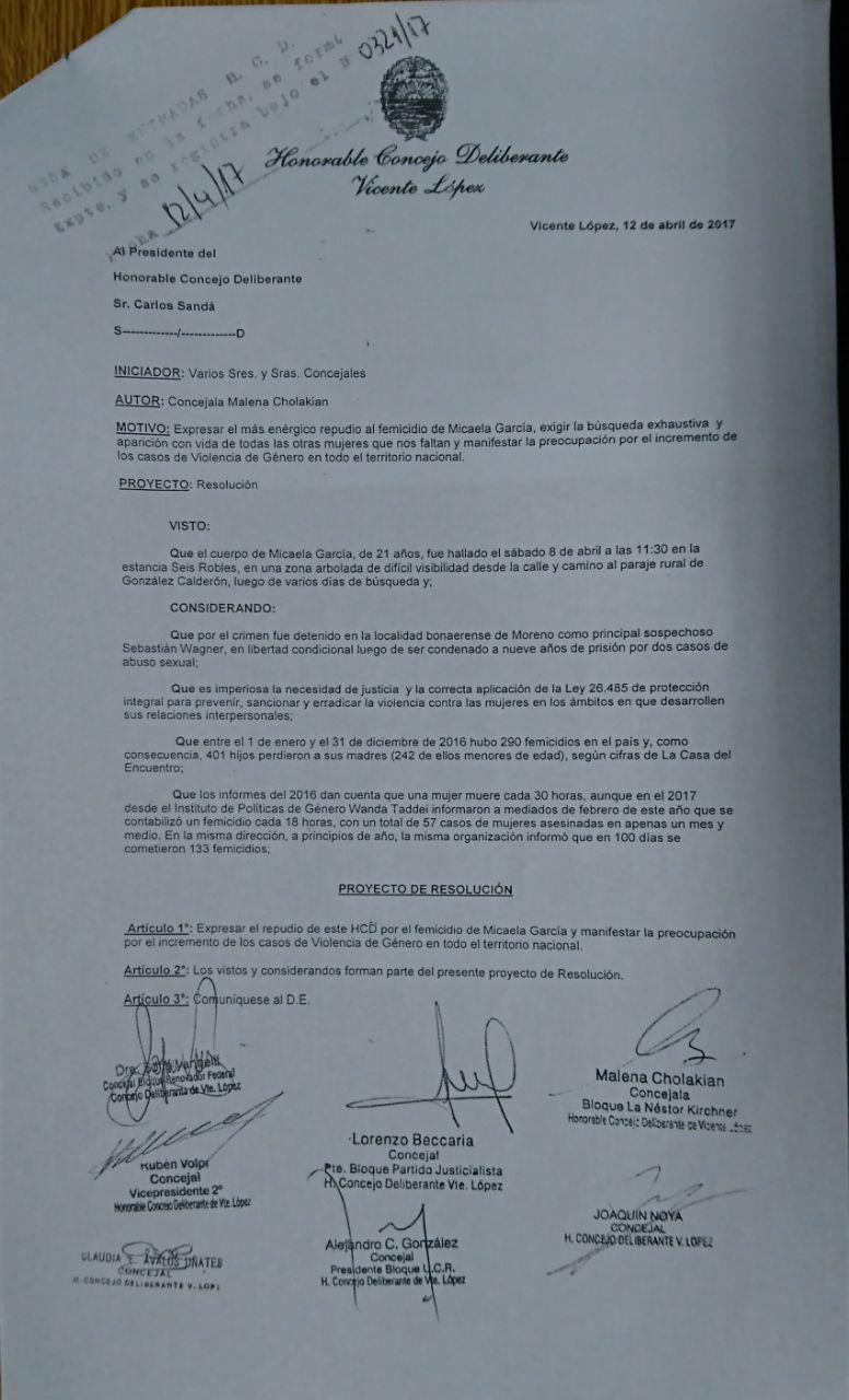 El Concejo Deliberante de Vicente López (Provincia de Buenos Aires) aprobó, por unanimidad, el Proyecto de repudio por el femicidio de Micaela García -presentado por la Concejala y Presidenta de la Comisión de Mujer, Niñez y Familia, Malena Cholakian, y acompañado por los concejales del Interbloque Fpv-PJ Joaquín Noya, Lorenzo Beccaria, Julieta Martinez Moltó y Ruben Volpi.