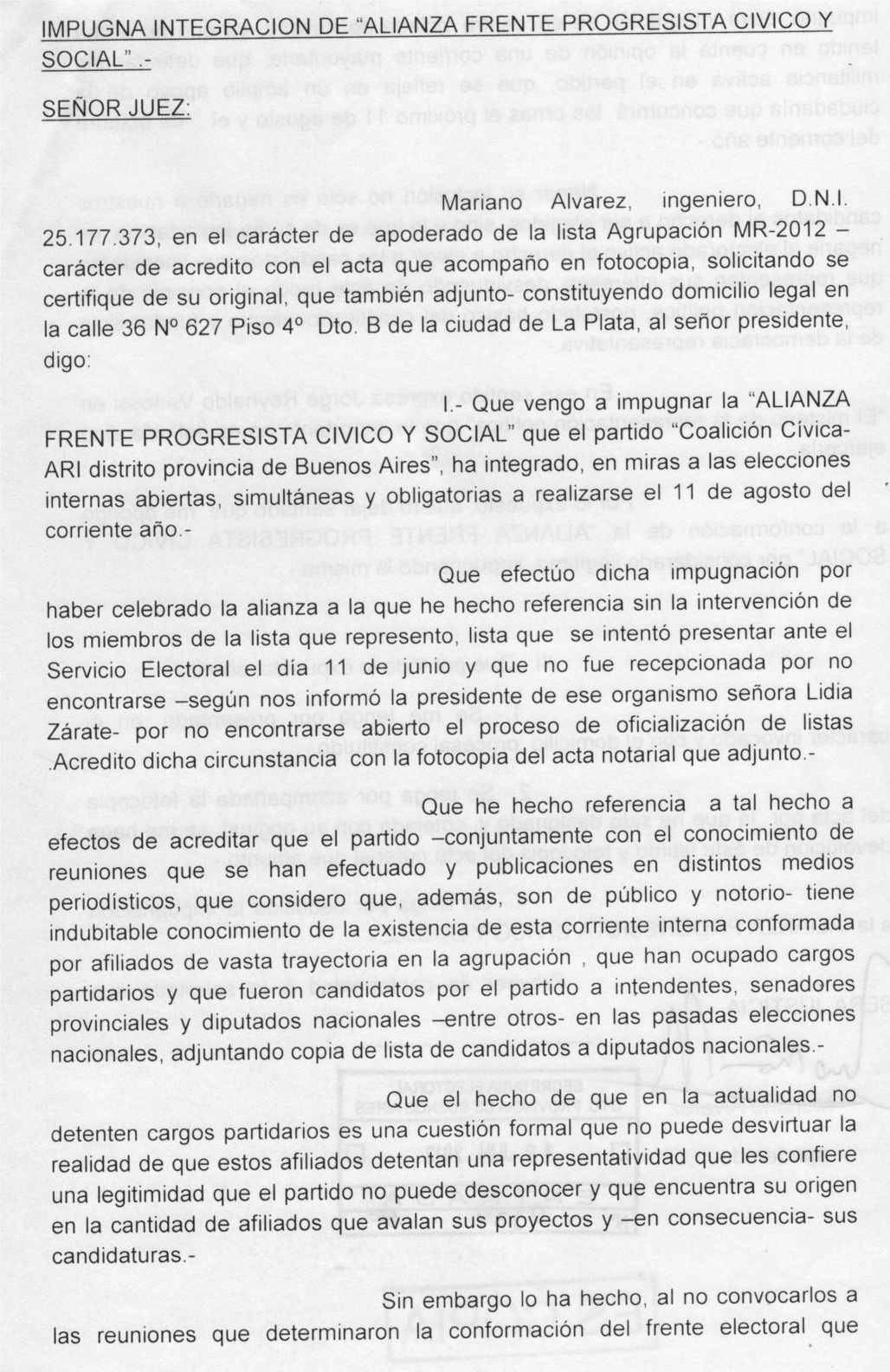 Fue mediante una presentación realizada durante la mañana del día martes de la semana en curso, en el juzgado electoral a cargo del Juez Blanco. Mariano Alvarez, apoderado de la agrupación MR-2012 (espacio liderado por Elisa Carrió y Héctor 'Toty' Flores), presentó una impugnación judicial contra la Alianza Frente Progresista Cívico y Social, por considerarla ilegitima.